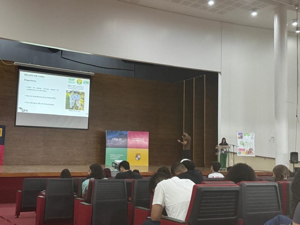 A convite da Universidade Federal do Acre (Ufac), Campus Rio Branco, o Instituto de Defesa Agropecuária e Florestal do Acre (Idaf) participou da palestra “Raiva dos Herbívoros no Município de Mâncio Lima, Acre: achados clínicos, diagnóstico e ações de controle”, ministrada pelo estudante Pedro Vinícius Barbosa. O evento integrou a programação da 17ª Semana Acadêmica de Medicina Veterinária (Savet) e contou com dados das ações que o Idaf vem executando em todo o estado.