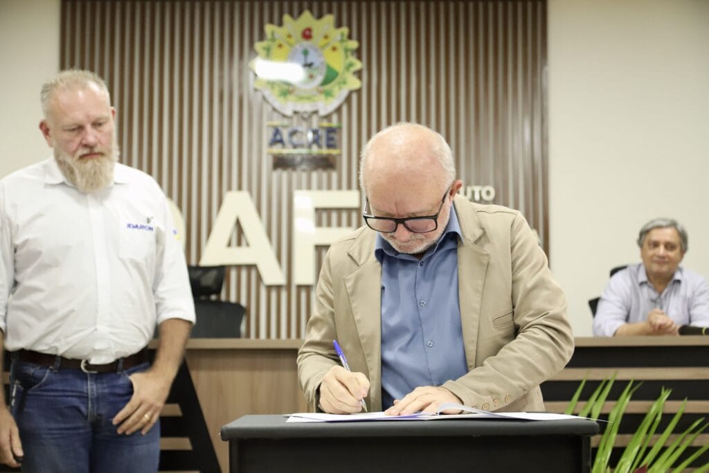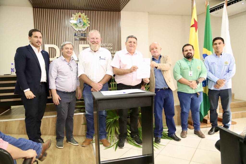 Em uma ação conjunta para fortalecer a vigilância sanitária e garantir a manutenção do status sanitário conquistado, o governo do Acre, por meio do Instituto de Defesa Agropecuária e Florestal (Idaf), a Agência de Defesa Agropecuária e Florestal do Amazonas (Adaf) e a Agência de Defesa Sanitária Agropastoril de Rondônia (Idaron), responsáveis por conduzir as ações de defesa sanitária em seus respectivos estados, assinaram, na tarde desta quinta-feira, 7, no auditório do Idaf, em Rio Branco, um termo de cooperação técnica com a presença do coordenador-geral de Planejamento em Saúde Animal do Ministério da Agricultura e Pecuária (Mapa), Geraldo Marcos de Moraes.